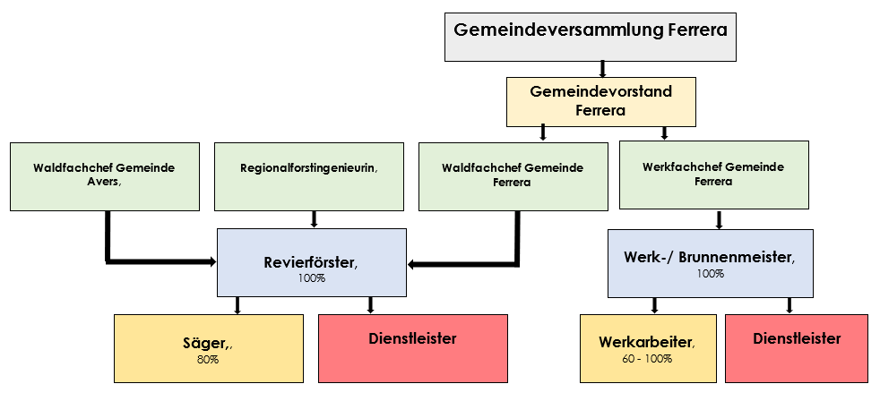Mit dem neuen kantonalen Finanzausgleich steht Ferrera vor grossen finanziellen Herausforderungen. Die bisherige Struktur mit einem kombinierten Werk- und Forstbetrieb ist aufgrund hoher Fixkosten und des anhaltenden Fachkräftemangels nicht mehr tragfähig. Nach der Kündigung des Vorarbeiters im Forstbereich 2024 konnte die Stelle trotz intensiver Suche nicht neu besetzt werden. Der Gemeindevorstand hat deshalb entschieden, die Forstarbeiten künftig an Drittanbieter zu vergeben. Dadurch können der Hiebsatz eingehalten, die Betriebssicherheit gewährleistet und die Gemeindefinanzen entlastet werden. Der Werkbetrieb bleibt mit zwei Mitarbeitenden lokal verankert und stellt die hoheitlichen Aufgaben in den Bereichen Strassen, Wasser und Werkhof sicher. Ziel ist eine finanziell tragbare und zukunftsfähige Organisationsstruktur, die den Bedürfnissen der Gemeinde entspricht und gleichzeitig Arbeitsplätze soweit möglich erhält. Das Amt für Wald und Naturgefahren unterstützt die Gemeinde in dieser Neuausrichtung.
